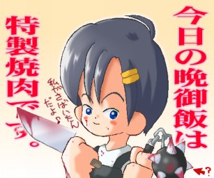 最初は、包丁持ってお料理〜、とかいうのをと思ってたのに。 いつのまにかモーニングスター持たせてたり、返り血あびたりとか。 なんか病んでるのかしら。
